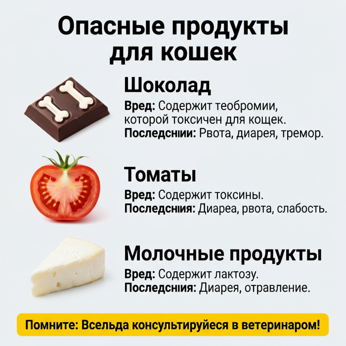 Каждый любящий хозяин хочет побаловать свою кошку вкусненьким. Кусочек со стола, глоток молока, долька шоколада — кажется, что в этом нет ничего страшного. Однако многие продукты, совершенно безопасные для человека, могут быть токсичными и даже смертельно опасными для кошек. Кошачий организм устроен иначе: у него другой обмен веществ, другие ферменты, и то, что мы едим каждый день, может вызвать у питомца серьёзное отравление. В этой статье мы подробно разберём, какие продукты категорически нельзя давать кошкам и к каким последствиям это может привести.
